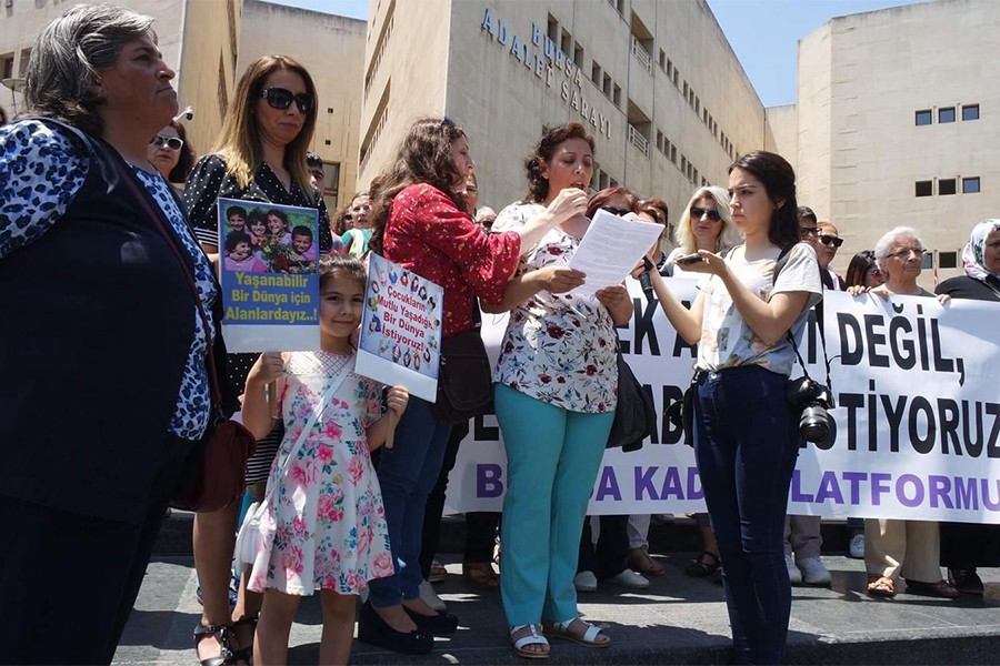 Bursa Kadın Platformu, Anadolu Adliyesinde bir avukatın etek boyunun fotoğrafını çekmek isteyen avukatın tacizine, çocuk istismarına, kadına yönelik şiddete karşı Bursa Adliyesi önünde açıklama yaptı.