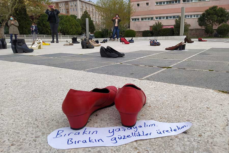 “Kadın cinayetlerinin durmamasının sebebi İstanbul Sözleşmesi’nin etkin uygulanmamasıdır” diyen kadınlar, Nisan ayında katledilen kadınların isimlerini ve yaşadıklarını hatırlattı. 6284 sayılı yasanın etkin uygulanmamasına ve kadın cinayetlerinin önlenmemesine tepki gösteren kadınlar, meydana bıraktıkları ayakkabıların ardından oturma eylemi gerçekleştirdi.
