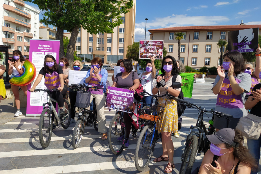 Türkiye’nin İstanbul Sözleşmesi’nden çekilme kararı 1 Temmuz’da resmileşecek. Kadınlar ülkenin dört bir yanında çekilme resmileşmeden karardan vazgeçilmesi için eylemliliklerini sürdürüyor. Çanakkale’de İstanbul Sözleşmesi İnisiyatifinden kadınlar bisikletli eylemleriyle birlikte basın açıklaması yaparak karara tepki gösterdi.