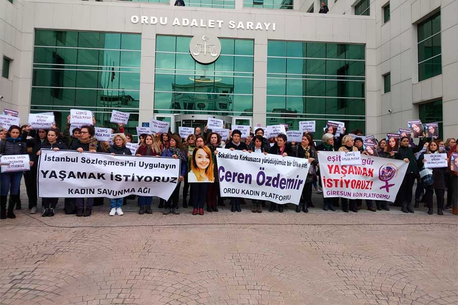 Ordu Üniversitesi Müzik ve Sahne Sanatları 3’üncü sınıf öğrencisi Ceren Özdemir’i (20), evinin önünde bıçaklayarak öldüren, yakalandığı anda da 2 polis memurunu bıçaklayarak yaralayan Fail Özgür Arduç’un 3 kez ağırlaştırılmış müebbetle yargılandığı dava Ordu Adliyesi 1. Ağır Ceza Mahkemesi’nde başladı. Davaya Artvin, Trabzon illerinden yoğun katılım olurken, onlarca kadın da adliye önünde toplandı.