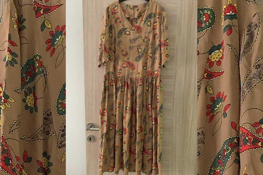 Cezaevine alınmayan kahverengi elbise üzerinde bulunan çiçek desenlerinde sarı kırmızı ve yeşil renkler yer alıyor.