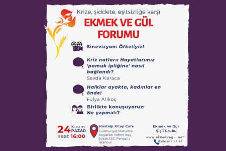 Şişli Ekmek ve Gül Grubunun çağrısıyla kadınlar “Krize, şiddete, eşitsizliğe karşı Ekmek ve Gül Forumu”nda bir araya gelecek. Forum, 24 Kasım Pazar günü saat 16:00’da Nostalji Kitap Evi’nde.