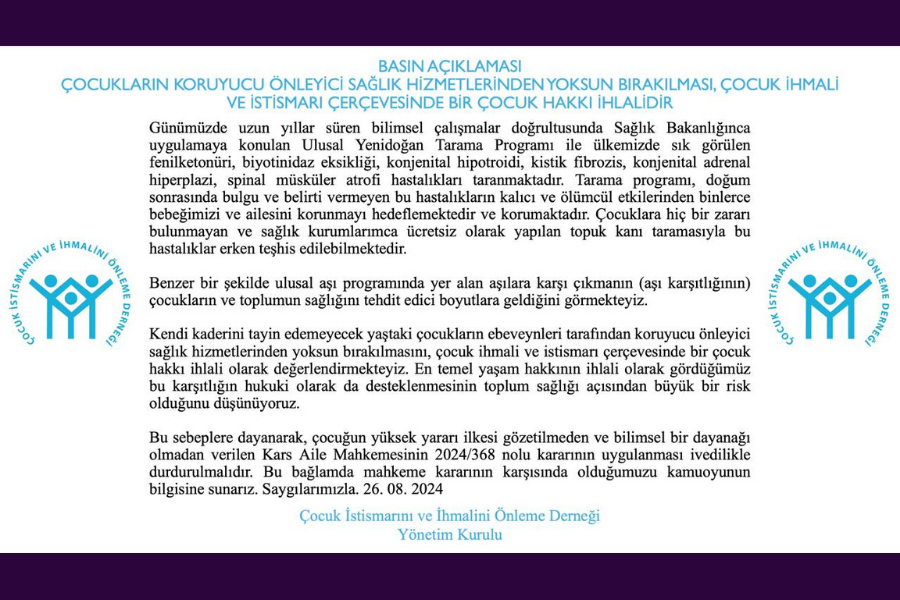 Çocuk İstismarını ve İhmalini Önleme Derneği, Kars Aile Mahkemesinin verdiği topuk kanı taraması kararına ilişkin bir basın açıklaması yayınladı.