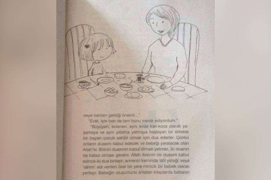 “Hatırlarsan, çocuklardan anne baba olamayacağını, anne baba olabilmek için büyümek gerektiğini anlatmıştım. Büyüyen, evlenen, aynı evde karı-koca olarak yaşamaya ve aynı yatakta yatmaya başlayan bir erkekle bir bayan çocuk sahibi olmak için dua ederler. Çünkü onların duasını kabul edecek ve bebeği yaratacak olan Allah’tır. Birinin duasının kabul olması yetmez. İki duanın da kabul olması gerekir. Allah ikisinin de duasını kabul edince, iki dua birleşir, annenin karnında özel bir yere, gözle görülemeyecek kadar minicik bir bebek olarak yerleşir. İki duanın birleşmesine “döllenme”, minik bebeğin anne karnında yerleştiği özel yere ‘döl yatağı’ veya ‘rahim’ adı verilir.”