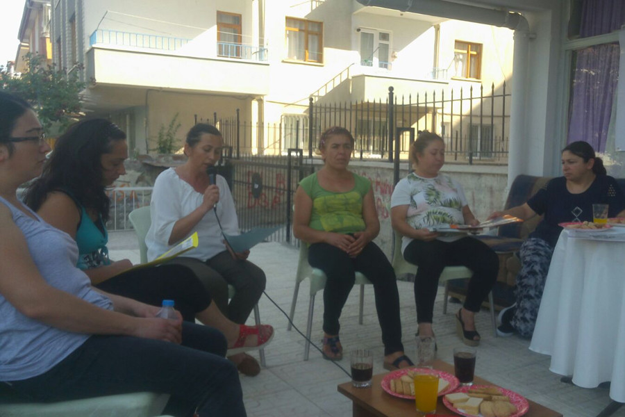 Ankara'da Tuzluçayır Kadınları Dayanışma Derneği bahçesinde yapılan buluşmada kadınlar resmi nikah tasarını değerlendirdi. Kalabalık ortamlarda bulunmaktan, söz alıp bir şey anlatmaktan çekindiklerini söyleyen kadınlar, “Bu buluşma ile hem kendimize güvenimizi kazanıyoruz, kalabalık karşısında mikrofon tutuyoruz, hem de bizlerin hayatlarını baskılayan, çeşitli yasalar ile haklarımızı gasbetmeye çalışan uygulamaları tartışıyoruz” dedi.
