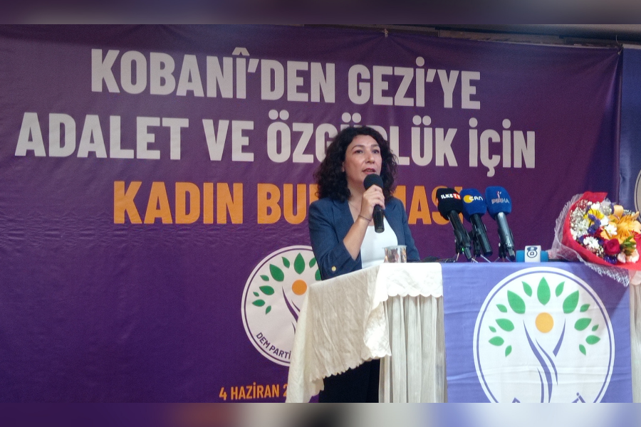 Açılış konuşmasını yapan DEM Parti Kadın Meclisi Sözcüsü Halide Türkoğlu, "Bizler itaat etmeyeceğiz, biat etmeyeceğiz. Özgürlük ve eşitlik mücadelemizi daha çok yükseltmenin sözünü veriyoruz. Figen Yüksekdağ'ın ‘Son sözü direnenler söyler’ sözü çok anlamlı bir söz. Şu an iktidar bir sona doğru gidiyor. Özgürlük ve eşitlik mücadelesi veren, başta kadınlar olmak üzere halkların, emekçilerin mücadelesine son vermek istiyor. Bu tarihsel iki davanın son sözünü de bizler kuracağız" dedi. Türkoğlu, Gezi davasında ve Kobane davasında yargılanan kadınların mücadelesine selam gönderdi. Kayyum atamalarının, Kobane ve Gezi davasının birbirinden bağımsız olmadığını dile getiren Türkoğlu, "Faşizmin ilerlemesini durduracak olanlar, biz kadınlarız. Son sözü biz kadınlar söyleyeceğiz” dedi.