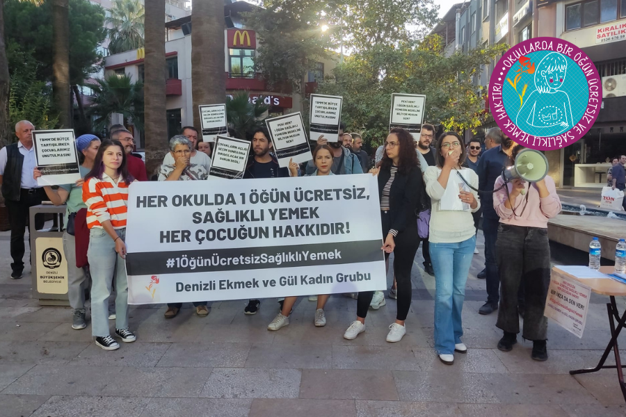 Denizli Ekmek ve Gül Grubu, bugün Candoğan Parkı’nda “Her okulda 1 öğün ücretsiz, sağlıklı yemek haktır!” demek için basın açıklaması gerçekleştirdi.