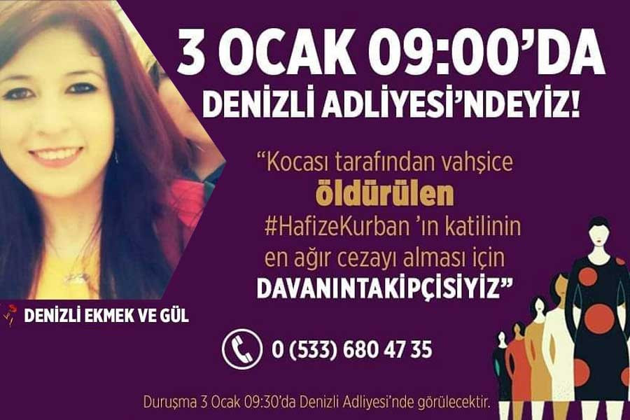 Denizli’nin Pamukkale ilçesinde geçtiğimiz aylarda eşi tarafından katledilen Hafize Kurban davasının 2. duruşması 3 Ocak’ta yapılacak. Denizli Ekmek ve Gül Kadın Grubu, kadınları eşi tarafından katledilen Hafize Kurban’ın davasına sahip çıkmaya çağırıyor.