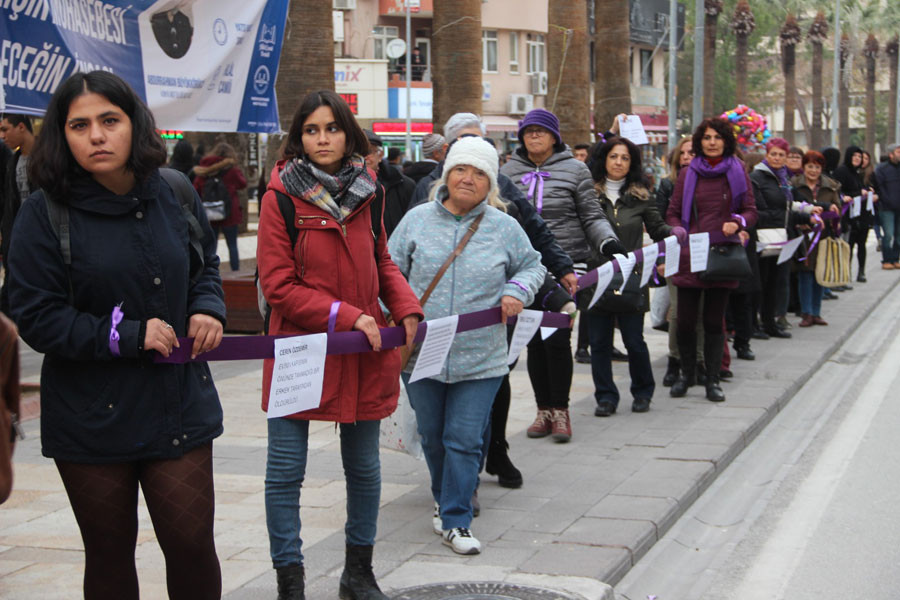 Denizlili kadınlar Delikliçınar Meydanı’nda basın açıklaması gerçekleştirdi. Candoğan Parkı’nda Delikliçınar Meydanı’na yürüyen kadınlar öldürülen kadınların isimlerinin yazılı olduğu bantlar taşıyarak insan zinciri oluşturdu.