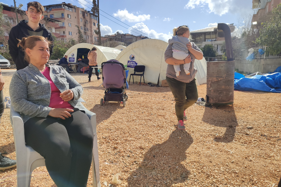 Sevgi Yeşiloğlu, evinin yanına kurduğu çadırda ailesi ile birlikte yaşıyor. Maddi ve manevi olarak depremden olumsuz etkilendiğini anlatan Yeşiloğlu, “Sözün bittiği yerdeyiz, çok üzülüyoruz. Kimi akrabamız bulunmuyor. Sabretmekten başka çaremiz yok. İnşallah gün gelecek Antakyamızı kadınlarımız, erkeklerimizle yeniden kuracağız” diyor. Yeşiloğlu, “Evimiz yıkılmadı ama içine girilmez halde. Dışarıda kalıyoruz. Çok berbat haldeyiz. Günümüz stresle geçiyor. Sağ olsunlar yemek getiriliyor ama kendimiz de yemek yapıyoruz. Çok şükür kahvemizi yapıyoruz. Ama yiyemiyoruz ki, ayakta kalacak kadar yiyoruz. İstediğin temizliği yapamıyoruz. Suyumuzu bahçede ısıtıyoruz, duşumuzu da alıyoruz, yemeğimizi de yiyoruz ama istediğimiz gibi olmuyor” diyor.