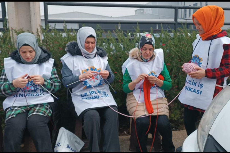 İçerideki baskılara karşı, çalışma koşullarının iyileştirilmesi için sendikalaşan kadınlar, sendika haklarında kararlı olduklarını ifade ederken yaşanan depremin yaralarını sarmak için direniş alanında atkı bere örerek deprem bölgesiyle dayanışma içerisinde olduklarını belirttiler.