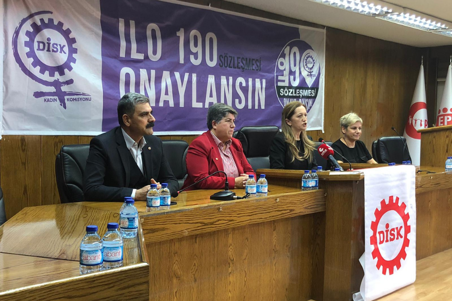 DİSK, ILO 190 Sayılı Şiddet ve Taciz Sözleşmesinin onaylanması için yürüttüğü kampanyaya ilişkin basın açıklamasında bulundu. Bugün ve yarın TBMM'de siyasi partiler ile Çalışma ve Sosyal Güvenlik Bakanı'nı ziyaret ederek ILO'nun 190 sayılı Sözleşmesi'nin onaylanması talebini yineleyeceklerini belirten DİSK Genel Başkanı Arzu Çerkezoğlu, “ILO 190 sayılı Şiddet ve Taciz Sözleşmesi onaylanmalı, etkin biçimde uygulanmalıdır. Toplumsal cinsiyet temelli suçlarda, kadın cinayetlerinde cinsiyetçi iyi hal, tahrik indirimi gibi uygulamalardan vazgeçilmelidir. İktidarın politikalarında kadın istihdamını artırmak için önerilen esnek çalışma biçimleri yerine kadınlar için tam zamanlı ve güvenceli istihdam olanakları yaratılmalıdır” dedi.