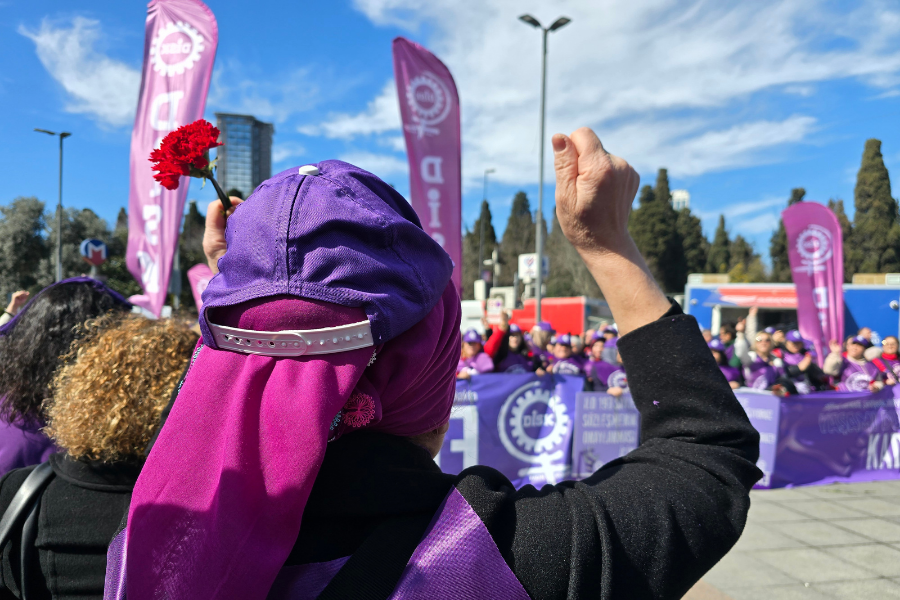 İzmir'de DİSK üyesi kadınlar 8 Mart Dünya Emekçi Kadınlar Günü öncesi eşit işe eşit ücret, kadın cinayetleri ve şiddete karşı mücadele ve kamusal sosyal politikaların hayata geçirilmesi talebiyle eylem yaptı. “Direne direne kazanacağız”, “Susmuyoruz, korkmuyoruz, itaat etmiyoruz”, “Kadın cinayetleri politiktir” sloganları ile Konak Eski Sümerbank önüne yürüdü. Basın metnini kadınlar adına Genel-İş 9 No’lu Şube Kadın Komisyonu Başkanı Seven Şen okudu. Aile Yılı adı altında kadınların sadece aileyle sınırlandırılmasını kabul etmediklerini belirten Şen, “Asgari ücret dahi hâlâ tek kişi üzerinden belirlenirken, kadın yoksulluğu ve işsizliği katmerlenerek artarken iktidarın bu yılı Aile Yılı ilan etmesinin altında yatan sebeplerin neler olduğunu biliyoruz. Biz kadınları bir kez daha eve hapsetmek, ucuz işgücü olarak kullanmak, esnek ve güvencesiz çalıştırmak ve bakım yükünü bir kez daha kadınların üzerine yığmak. Kadınların yalnızca aile içinde tanımlanması ve sınırlandırılmasını kabul etmiyoruz” dedi.