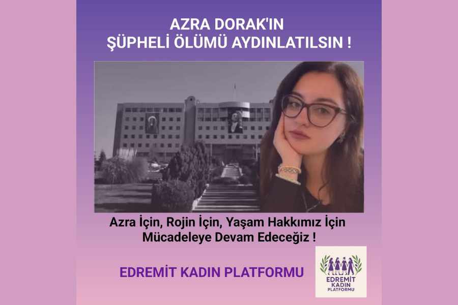 Edremit Kadın Platformu, Balıkesir Üniversitesi öğrencisi Azra Dorak'ın kaldığı KYK yurdundan hayatını kaybetmesi ve olayın medyaya "intihar" olarak yansıtılmasına ilişkin bunun bir şüpheli ölüm olduğuna ve soruşturulması gerektiğine ilişkin basın metni yayımladı.