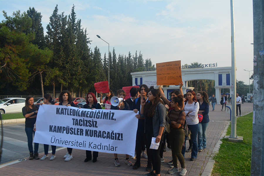 Ayrıca üniversiteli kadınlar ise Ege Üniversitesi kampüs girişinde konuyla ilgili basın açıklaması gerçekleştirdi. Basın açıklamasını okuyan Meryem Yıldırım, “Üniversitelerde toplumsal cinsiyet eşitliği dersleri uygulanması gerekirken bu dersler YÖK yönetmeliğinden kaldırılmıştır. İki gün önce üniversitede kadınları taciz eden erkek akılla toplumsal cinsiyet eşitliği yönetmenliğini derslerden kaldıran akıl aynıdır. Üniversitelerde güvenlik, ehliyetsiz traktör kullandırmakla, taciz eden kişiyi bir günde serbest bırakmakla, güvenlik sayısını artırmakla sağlanmaz. Bu erkek akıl değişmedikçe kadınların güvenliğinden söz etmeniz inandırıcı değildir” dedi.