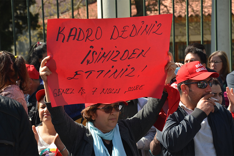 DİSK Ege Bölge Temsilcisi Memiş Sarı, hükümetin kadro düzenlemesinin, yüz binlerce işçinin kadro haklarını gasbettiğini, binlerce işçiyi işinden ettiğini dile getirdi. 2 Nisan itibarıyla kadroya geçişlerin tamamlandığını söyleyen Sarı, sürecin başladığı ilk günden bugüne belirsizlik ve karmaşanın doğurduğu endişenin işyerlerinde devam ettiğini ifade etti.