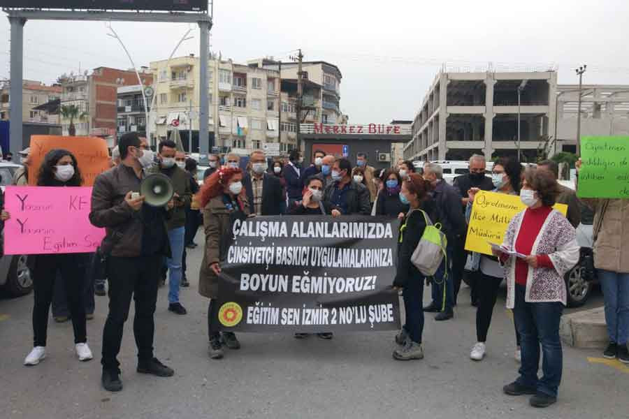 Menemen İlçe Milli Eğitim Müdürü M. B.’nin öğretmen Songül Yılmaz Kızılkaya’ya görevli olduğu okulda uyguladığı sözlü şiddetin ortaya çıkması üzerine Eğitim Sen İzmir 2 No’lu Şube İlçe Milli Eğitim Müdürlüğü önünde basın açıklaması yaptı.