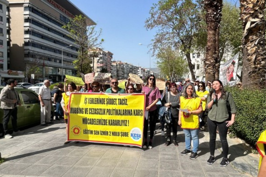 Eğitim ve Bilim Emekçileri Sendikası (Eğtim Sen) İzmir 2 Nolu Şubesi, şiddet, taciz, mobbing ile cezasızlık politikasına karşı açıklama yaptı. Karşıyaka İlçe Eğitim Müdürlüğü önünde bir araya gelen Eğitim Sen üyeleri, “İş yerlerinde şiddet, taciz, mobbing ve cezasızlık politikalarına karşı mücadelemizde kararlıyız” pankartını taşıyarak, sık sık “Asla yalnız yürümeyeceksin” sloganı attı. Açıklamayı yapan Şube Başkanı Zeliha Danyeli, Karşıyaka Şehit Ahmet Oruç Orta Okulu’nda Müdür Yardımcısı olarak görev yapan N. K.’nin aynı okulda görev yapan üyelerinin telefon numarasını eskort ilanıyla internet sitelerinde yaydığını belirtti.