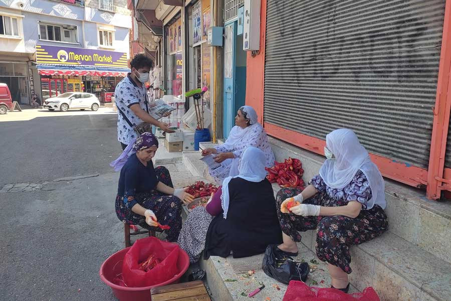 Düztepe Mahallesi’nde kışlık hazırlığı yapan bir grup kadına uzatıyorlar bildiriyi. Kadınlar önce bildirinin içeriğini soruyor, “Eğitimde yaşanan sorunlara dair” karşılığını alınca başlıyorlar anlatmaya. İçlerinden biri konuşuyor önce: “Ben üç çocuk okutuyorum, çocuklarımdan ayrı ayrı para istemişler. Liseye giden çocuğum için 500 lira, ortaokula giden çocuğum için 250, ilkokula giden çocuğum için 150 lira istediler. Okuldan haber yollamışlar, eğer istenilen parayı vermezsek çocuklara okul tarafından kitap verilmeyeceğini söylemişler” diyor.