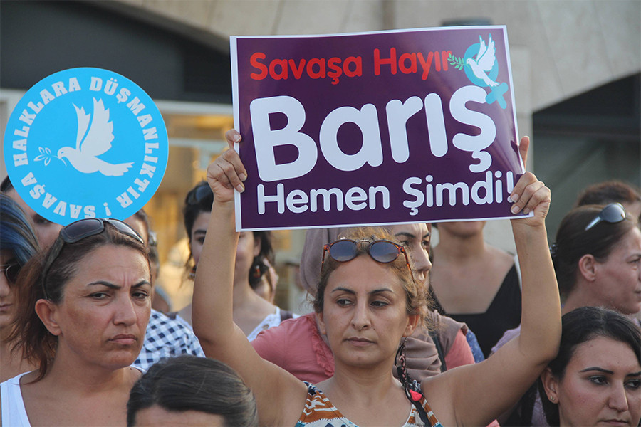 Kadınlar ‘Savaşın acılarını en çok yaşayan biziz ve çocuklarımız. Savaşın olmadığı bir dünya istiyoruz’ diyor.