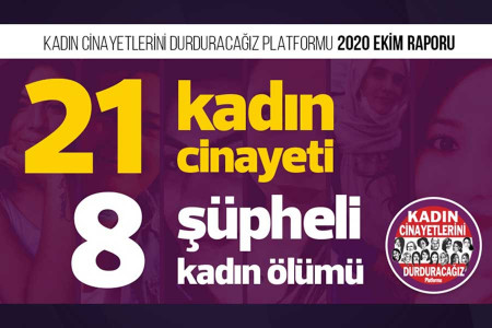 Kadın Cinayetlerini Durduracağız Platformunun 2020 yılı ekim ayı raporuna göre, ekim ayında 21 kadın cinayeti yaşanırken 8 kadının ölümü şüpheli olarak yansıdı.
