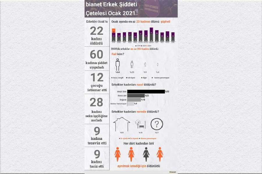 Bianet, yerel ve ulusal gazetelerde, haber sitelerinde ve ajanslarda yer alan haberlerden derlediği “Erkek Şiddeti Çetelesi Ocak 2021” raporunu paylaştı. Rapora göre erkekler; ocak ayında