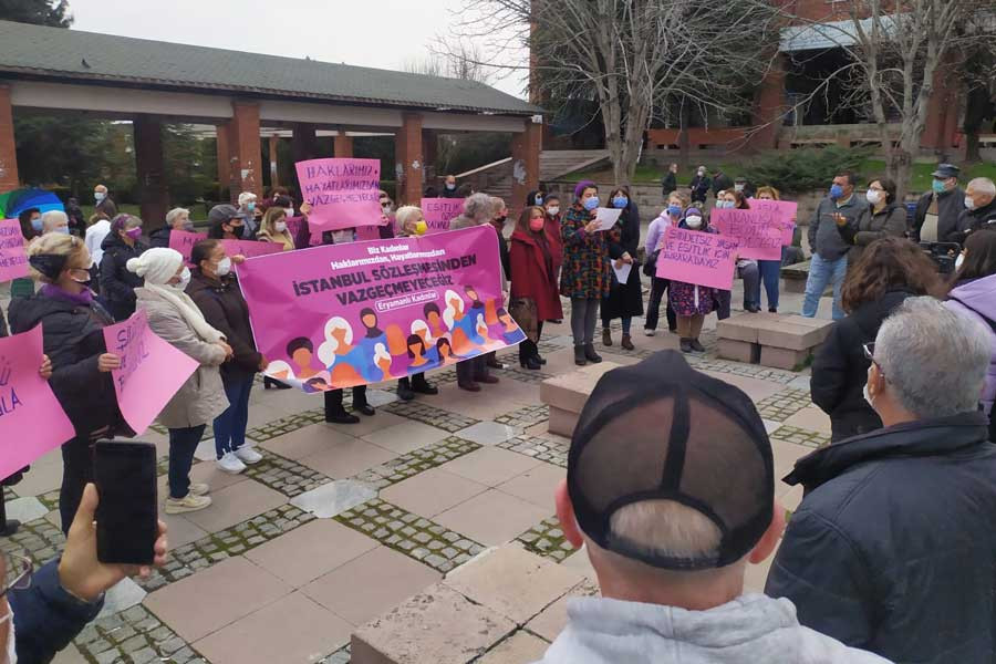 Ankara Eryaman’da bir araya gelen kadınlar, Türkiye’in İstanbul Sözleşmesi’nden çıkmasına tepki gösterdi. Eryaman 3. Etap Çarşı önünde bir araya gelen kadınların yaptığı basın açıklamasına Pir Sultan Abdal Eryaman Şubesi, Eğitim Sen 4 No’lu Şube, Emek Partisi, CHP, HDP, HDK katıldı. Burada açıklama yapan Eğitim Sen Ankara 4 No’lu Şube Yöneticisi Edge Tedik Ejderoğlu, kadınlar için hayati öneme sahip olan İstanbul Sözleşmesi’nden tek adamın kararıyla çekilinmesini kabul etmediklerini belirterek, “Eryamanlı Kadınlar olarak bir kez daha diyoruz ki; makbul kadın olmayacağız. Haklarımızdan, hayatlarımızdan vazgeçmemek için mahalle mahalle, semt semt mücadelemizi büyüteceğiz” dedi.
