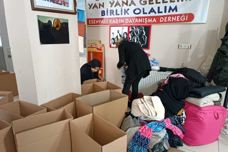 Esenyalı Kadın Dayanışma Derneğinin yardım çağrıları hızla yanıt buldu. Dernek üyesi kadınlar derneğe ulaşan yardımları deprem yaşanan illere göndermek üzere kolilemeye başladı.