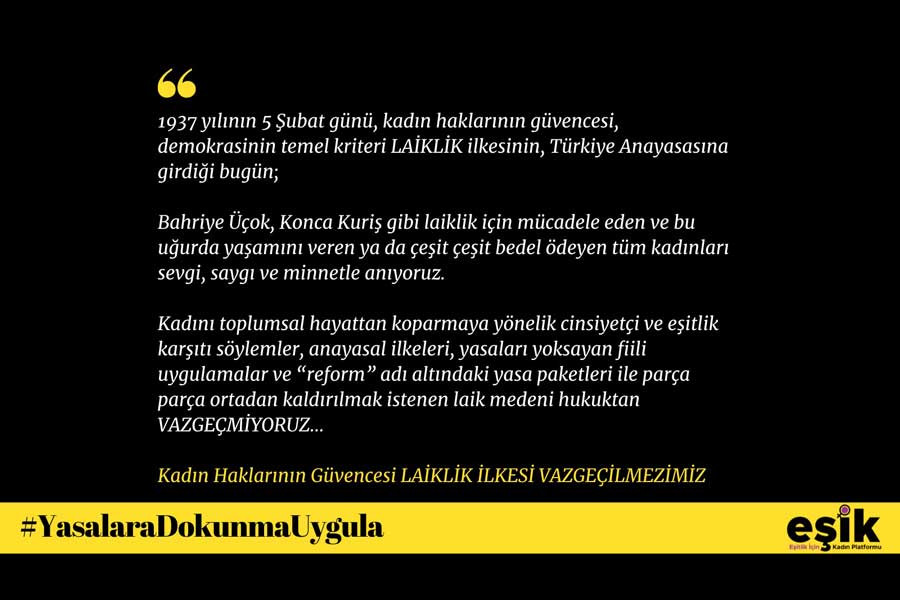 Eşitlik İçin Kadın Platformu-EŞİK laiklik ilkesinin, anayasal bir ilke olarak kabul edilmesinin (5 Şubat 1937) yıl dönümünde “Laiklik ilkesi vazgeçilmezimiz” diyerek açıklama yaptı. EŞİK açıklaması şöyle: