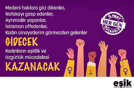 EŞİK, 8 Mart için yaptığı açıklamada 'Mücadelemizi, eşitlik, özgürlük ve laiklik ilkelerinden ödün vermeden sonuna dek sürdüreceğiz' dedi.
