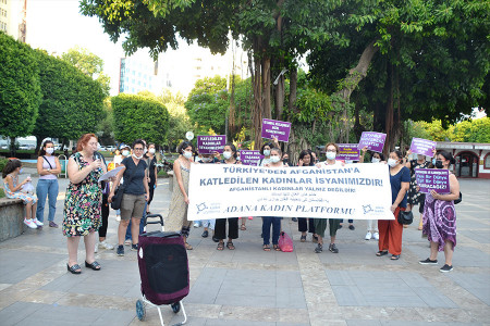 Taliban'ın Afganistan'da yönetimi ele geçirmesinin ardından Afgan kadın ve çocuklarının tehdit altında olduğuna dikkat çeken Adana Kadın Platformu İnönü Parkı’nda Afgan kadınlar için eylem yaptı.