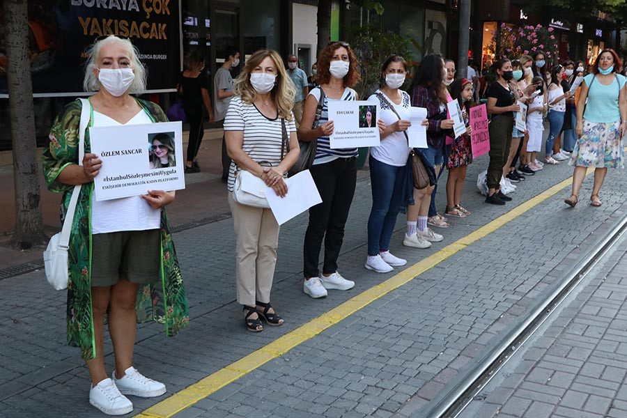 Eskişehir Demokratik Kadın Platformu çağrısıyla İsmet İnönü Caddesinde bir araya gelen kadınlar, İstanbul Sözleşmesinin iptal edilmek istenmesine tepki gösterdi. Katledilen kadınların fotoğraflarını taşıyan Platform üyeleri kadın zinciri oluşturdu. 'İstanbul Sözleşmesi’nden vazgeçmiyoruz' diyen kadınlar, İstanbul Sözleşmesinin maddelerini okudu.