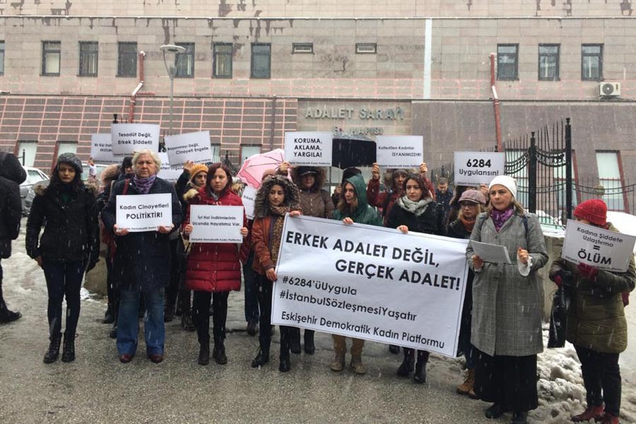 Eskişehir’de Demokratik Kadın Platformu üyesi kadınlar, ayrıldığı Yalçın Özalpay tarafından satırla başına vurularak öldürülen 2 çocuk annesi Ayşe Tuba Arslan için adliye önünde eylem yaptı. Kadınlar adına konuşan avukat Pınar Çelik Arpacı, Ayşe Tuba’nın eski eşine yönelik 23 kez suç duyurusunda bulunduğunu hatırlatarak, “23 kez hayatta kalmak için çığlık çığlığa yardım istedi, aman diledi, kendisine yaşatılan korkunun cezalandırılmasını bekledi bu sarayın kapısında. Ancak Ayşe Tuba’nın yürekleri dağlayan hikayesi ve cansız bedeni düştü” dedi.
