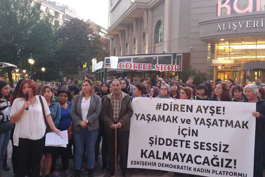 Karasu’nun açıklamalarından sonra kadınlar adına Roza Tural basın açıklaması yaptı. Ayşe’nin hikâyesinin kimse için yeni veya alışılmadık olmadığını ifade eden Tural, “Yıllarca süren sorunlu bir evlilik, kadının boşanmak istemesi ancak gelecek kaygısıyla boşanamaması, devam eden baskı ve tehditler… Uzunca bir süre boşanma sonrası kendi ayakları üzerinde durabilmenin koşulları için hazırlanıyor Ayşe ve nihayet boşanıyor. Sancılı süreç ne yazık ki Ayşe için boşanmayla bitmiyor. Eski eşi hakkında aldırdığı uzaklaştırma kararına rağmen zor ve tehdit ailesine de sıçrıyor ve bu defa şiddet; birçokları için yaşanılır ve güvenli şehir olarak bilinen Eskişehir’in en merkezi konumlarından birinde elinde satırla ortaya çıkıyor” diye konuştu.Artık kadınlar için hiçbir yerin güvenli olmadığını vurgulayan Tural, kadına yönelik şiddetinin bu kadar aymazca ortaya çıkması, saldırganların bu kadar cüretkâr olmasının ne tesadüfi ne de münferit olduğunu söyledi. Saldırganların bu cüreti kadın üzerinde erkeğin tahakküm kurabileceğini düşünen, kadını eve mahkûm etmek isteyen iktidar anlayışından ve sistemden aldığını kaydeden Tural, “Çünkü ülkemizde kadının yaşamı, devlet görevlileri veya dini yetkililerin müdahale alanı haline getiriliyor. ‘Hamile kadınlar sokağa çıkamaz, kadınlar herkesin içinde kahkaha atamaz, hayırlı kadın ramazanda sokakta yemek yiyemez’ ifadeleri ile toplumda kadın imgesi yeniden şekillendirilmeye çalışılıyor. Gazetelerde yer alan haberlerde, televizyonlarda yayınlanan dizilerde kadına yönelik şiddet meşrulaştırılıyor. Dizilerde, haberlerde en küçük ayrıntıya ceza yağdıran RTÜK, kadının boğazına dayanan bıçağı, dayağı görmüyor. Kadınların acıları üzerinde adeta reyting ve tıklanma yarışı yapılıyor. Adaleti sağlamak, vicdanlarda açılan yaraları dindirmekle görevli olan yargı ise katilleri ‘iyi hal’ ve ‘haksız tahrik’ adı altında indirimlerle ödüllendiriyor. Ders kitaplarında kadının yeri yine ikinci sınıf olarak betimleniyor ve yeni nesiller bu algıyla yetiştiriliyor. Tüm bunların yanında kadının sokakta, hayatın içinde olmasından rahatsız olan iktidar, kadını eve hapsediyor ve oradan çıkmasını istemiyor, kamusal alandan koparıyor; hatta boşanmasına bile karışıyor” dedi.