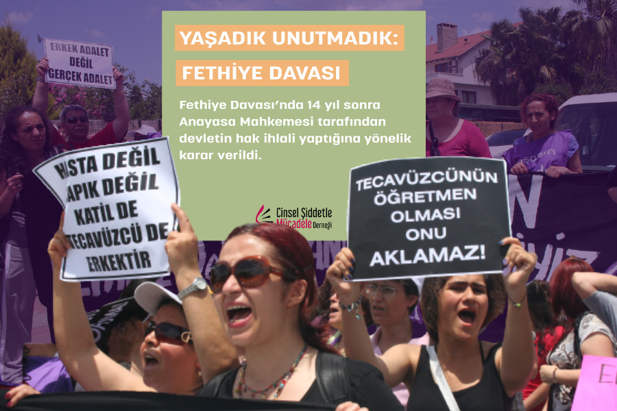 Fethiye Davası’nda 14 yıl sonra Anayasa Mahkemesi tarafından devletin hak ihlali yaptığına yönelik karar verildi. Fethiye Davası Türkiye’de cinsel şiddetle mücadelede bir eşiğin aşılmasına yol açan önemli davalardan biridir. Fethiye davası, kadın ve transların, kadın ve LGBTİ+ hareketi içerisinde cinsel şiddet alanında özgün bir örgütlenmenin başlamasında, tecavüz ve dahi farklı cinsel şiddet biçimlerinden hayatta kalanların örgütlenmesinde önemli bir kilometre taşıdır. Davanın açılması yıllarca engellendi, deliller karartıldı, haksızlık, adaletsizlik ve cezasızlık hem cinsel şiddetten hayatta kalanları hem de aktivistleri bir araya getirdi. Cinsel şiddete maruz bırakılan, davaları açılan, açılmayan, üstü kapatılan, davaları delil yetersizliğiyle ve beraat ile sonuçlanan kadınlar bu düzene meydan okudu. Öyle ki bu dava; etrafında birleşen aktivistlerin yarattığı enerjiyle Tecavüz Kriz Merkezlerini gündemimize ve de 2010 yılında meclisteki kadın milletvekillerinin gündemine taşıyan, tecavüze maruz bırakılan kadınların bir inisiyatif oluşturmasına ve devamında İstanbul ve diğer illerdeki Feminist kurum ve kolektiflerin emek ve ortak mücadelelerinin Cinsel Şiddete Karşı Kadın Platformu‘nu oluşturmasına ve bugün Cinsel Şiddetle Mücadele Derneği’nin kurulmasına giden yolun taşlarını döşeyen ilk ve en kuvvetli adımdır. Haksızlığın, hukuksuzluğun, adaletsizliğin ve cezasızlığın elle tutulacak kadar somutlaşmış halidir.
