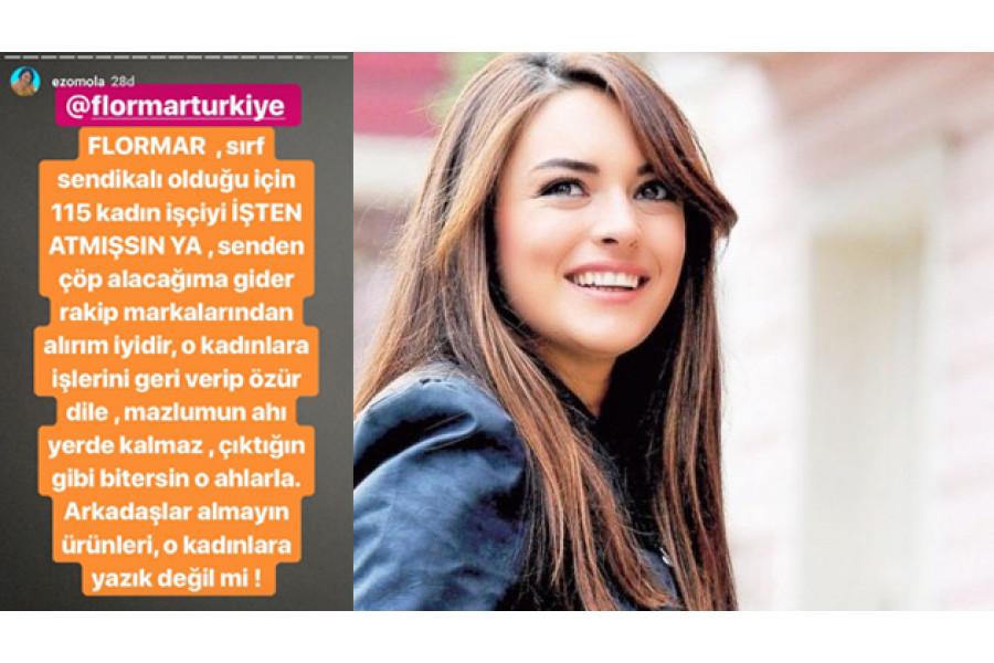 Sendikalaştıkları için işten atılan ve 18 gündür Gezbe’deki fabrika önünde direnen Flormar işçilerine bir destek de Ezgi Mola’dan geldi. Daha önce sosyal medya hesabından işçileri attığı için Flormar yetkililerine tepki gösteren Aslıhan Gürbüz’den sonra Oyuncu Ezgi Mola da sosyal medyadan Flormar işçilerine destek verdi. Flormar’ın bağlı olduğu Kosan Kozmetik Sanayi ve Ticaret AŞ’nin açıklamasını da paylaştı. Ezgi Mola işçilerin atılmasına şu sözlerle tepki gösterdi: