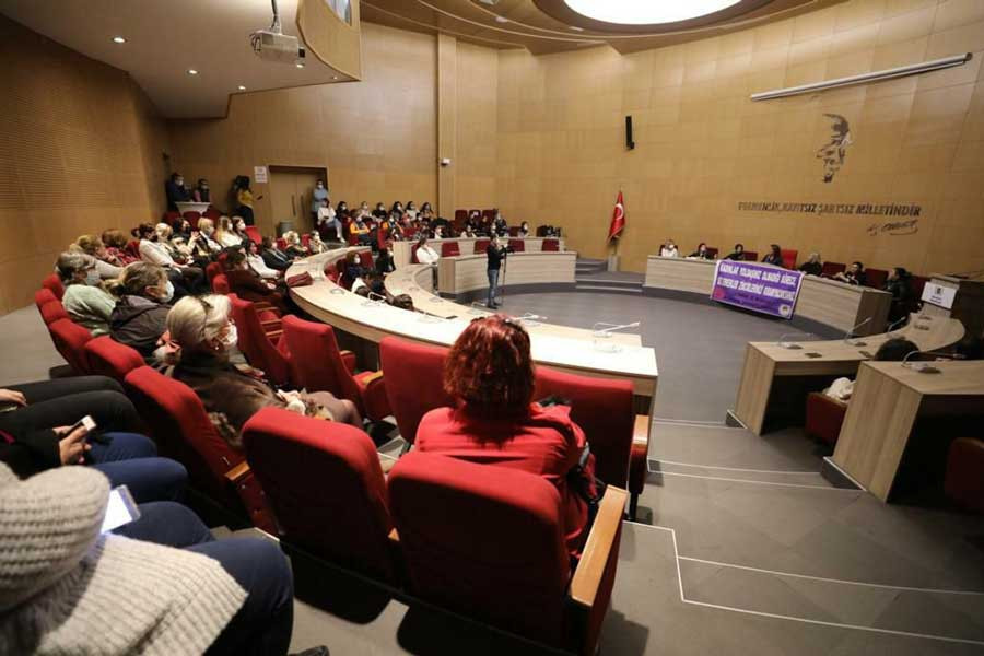 Gaziemir Belediyesi Meclis salonunda yapılan açıklamada kadın işçiler, “İstanbul Sözleşmesi yaşatır”, “Yaşasın kadın dayanışması” sloganları attı.