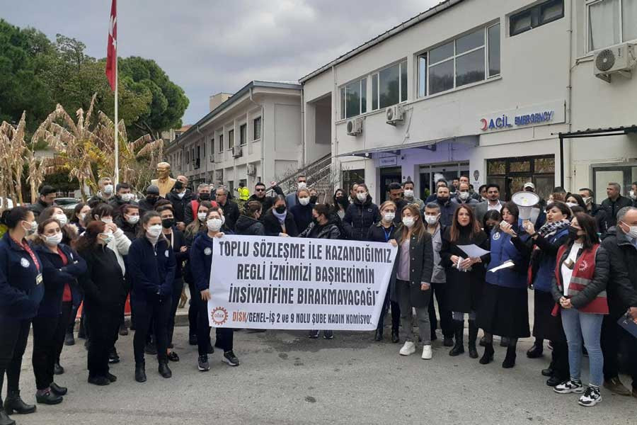 Zarıçlar, “Bundan tam 165 yıl önce ağır çalışma koşullarına karşı yapılan ilk büyük kadın direnişi olan 8 Mart yaklaşırken, bugün demokrasi belediyesi olarak anılan İzmir Büyükşehir Belediyesine bağlı Eşrefpaşa Hastanesinde toplu iş sözleşmemizde bin bir emekle kazandığımız regli iznimizi kullandırtmayan bir anlayışla karşı karşıyayız” diyerek sözlerine başladı.