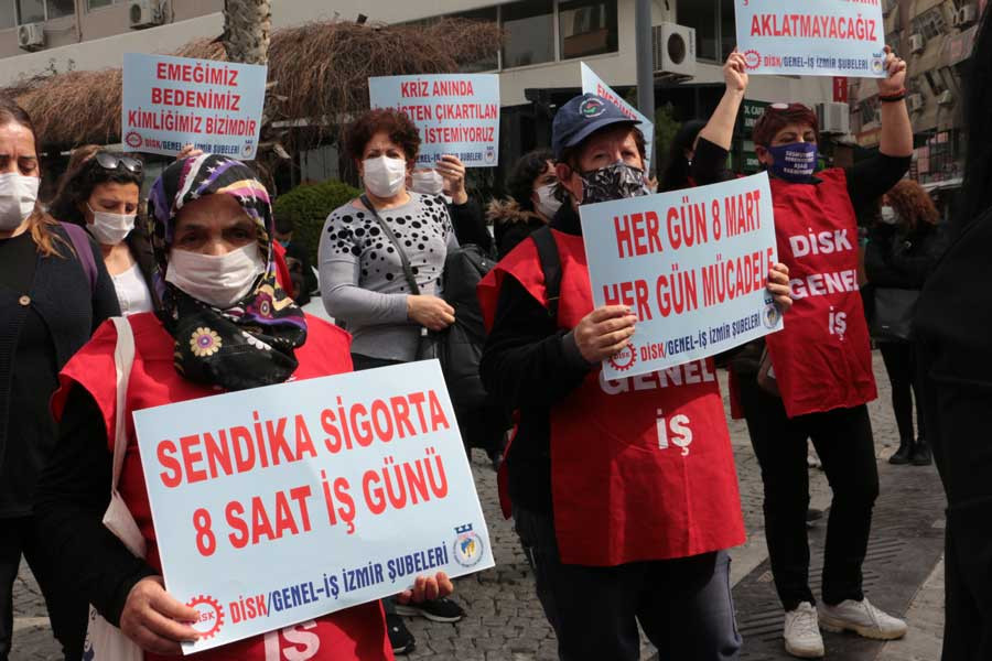 8 Mart’ı çalışarak karşılamak zorunda kalan, pandemi dönemi boyunca ağır koşullarla çalışmaya mecbur bırakılan, güvenceli iş, şiddetsiz yaşam ve eşitlik talebiyle işyerlerinden kadınların eylemleri…