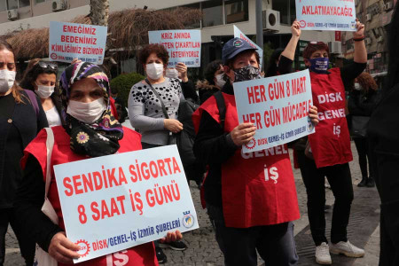 Genel-İş İzmir Şubelerine üye kadın işçiler basın açıklaması yaptı: Kadınlara sendikalı, güvenceli ve düzenli iş imkanı yaratılmalı, esnek çalışmaya ve ücret eşitsizliğine son verilmelidir.