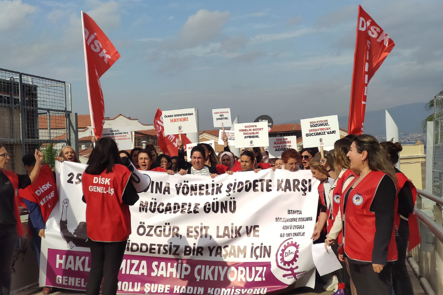 Genel-İş İzmir 2 ve 9 No’lu Şube Kadın Komisyonları, 25 Kasım kapsamında Konak Eski Sümerbank önünde basın açıklaması düzenledi.