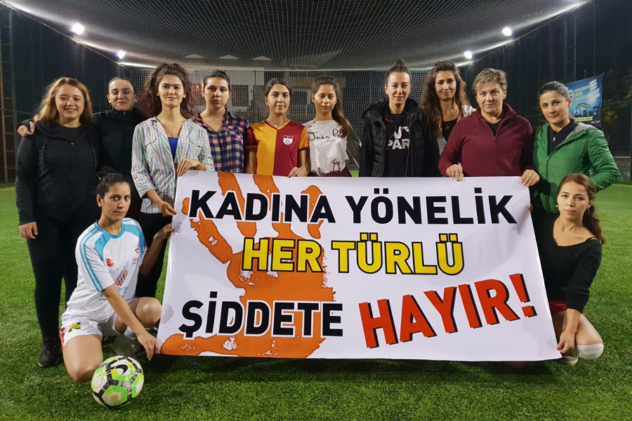 Halı saha maçında bir araya gelen platform üyeleri, açtıkları pankartla ‘Kadına yönelik her türlü şiddete hayır’ diyerek 25 Kasım’da Denizli Valiliği önünden başlayacak yürüyüşe çağrıda bulundu.