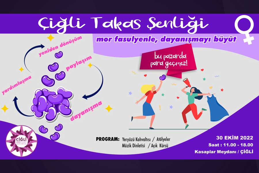 Çiğli Kent Konseyi Kadın Meclisi “Bu Pazarda para geçmez! Mor fasulyenle dayanışmayı büyüt“ temasıyla tüm kadınları 30 Ekim Pazar 11:00-18:00 arası Çiğli Kasaplar Meydanı’nda yapılacak 1. TAKAS ŞENLİĞİNE davet ediyor. Bu Pazar kaçmaz…