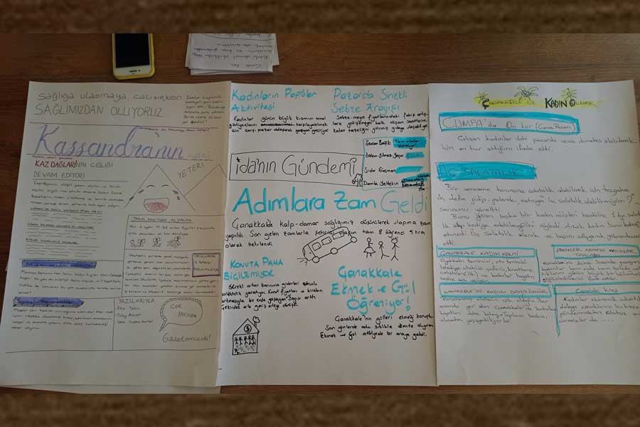 Atölyeye başlarken “etrafımızda haberini yapabileceğimiz farklı bir şey yok ki” diyen kadınlar atölyenin ardından yaşamlarında ne çok şey yaşadıklarını, kadınlara dair söyleyecek ne çok şeyleri olduklarını fark ettiler. Gıdaya gelen zamlarla pazardan eli boş dönüşleri, müsilajı, çevre köylerde termik santrallere karşı verilen mücadeleyi, Çanakkale’de yapılan ulaşım zammını, hastanenin kent merkezine uzaklığını, tarım işçisi kadınları hazırladıkları gazetelerinde öne çıkardılar.