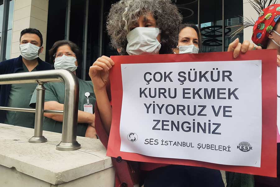 SES Şişli Şube Eş Başkanı Fadime Kavak da “Ülkenin ekonomik koşulları ortada, virüsten korunabilmek için sağlık çalışanlarının iyi beslenmesi gerekiyor ama gıda fiyatları ortada. Sağlıklı beslenmenin imkanı yok. Arkadaşlarımız kış gününde doğal olarak sıcak bir evde yaşamak istiyorlar ancak istekileri kadar doğal gazı açamıyorlar. Herkesin kabusu olan ekonomik kriz sağlık çalışanlarını da derinden etkiliyor” dedi. Pandemi başladığı anda kendilerini düşünmeden salgınla mücadelenin içine girdiklerini ifade eden Kavak, “Hiçbir özlük hakkımızın, ücret talebimizin dile getirildiği bir süreç yaşamadık. Ücreti ilk dile getiren zaten Sağlık Bakanı oldu. Bu bir göz boyamaydı, hekimler dışında yararlanabilen neredeyse olmadı” diye konuştu. Ek ödemesini almaya giden sağlık çalışanlarının ay sonunda komik bir tabloyla karşılaştığını söyleyen Kavak, “1 lira ödeme alan arkadaşlarımız oldu” dedi.