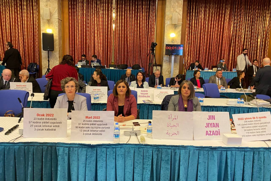 HDP’li vekiller, Bakan Yanık’ı “Jin, jiyan, azadî” yazılı dövizlerle protesto etti. HDP’li vekiller, dövizlerle kadın katliamlarına da dikkat çekti.