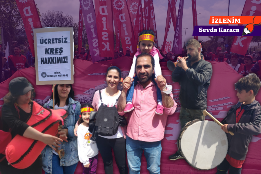 “Bu 1 Mayıs’tan çok umutluyum” cümlesini kuranlardan biri de Aydın ailesi. Kargo işçisi Mesut, eşi Sevda ve iki küçük kızları neşeyle yürüyorlar. Mesut, kargo işçilerinin direnişinde de yer almış. “Baskılar inanılmaz arttı o süreçten sonra, ben de isterdim o direniş alanında olan arkadaşlar hep burada olsaydı...” Sevda kargo işçilerinin iş bıraktığı o eylem günlerinde epey korkmuş, “1 gün işsiz kalmaya tahammülümüz yok bizim, hatta acaba katılmasa mı diye bile düşündüm. Kendisine de söyledim. ‘Bundan daha kötü ne olabilir ki Sevda’ dedi bana. Öyle gerçekten, kıt kanaat, daha ötesi yok” diyor. Aldıkları asgari ücret. Sevda ve Mesut, Bağcılar’dan Maltepe’ye çocuklarının geleceği için gelmiş. “Ve insan gibi çalışmak için” diyor Mesut, “İnsan gibi yaşamak için” diye ekliyor Sevda. Burada korkmadan ailecek yürüyebilmek çok güzelmiş, öyle söylüyor.