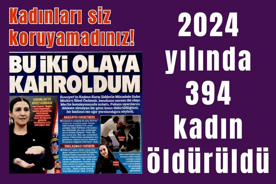 2024 yılında 394 kadın öldürülüp 259 kadın şüpheli şekilde ölü bulunmuşken, Hürriyet gazetesi 6 Ocak’ta Emniyet Genel Müdürlüğü Asayiş Daire Başkanlığı Aile İçi ve Kadına Karşı Şiddetle Mücadele Şube Müdürü Sibel Özdemir’in İçişleri Bakanlığı’nı ziyarete gelen komisyon üyelerine anlattığı kadınları suçlayıcı açıklamaları manşetine taşıdı.
