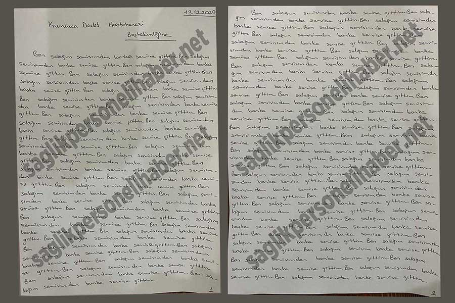 Sağlıkpersonelihaber.net’te yer alan habere göre, hastanenin başhekimi Ayşegül Alkan, Sağlık Müdürlüğü yetkililerine hastaneyi gezdirirken başka bir hastaya yardıma giden iki hemşirenin yerinde olmadığını fark etti. Alkan, bunun üzerine nöbetçi hemşireye “A4 kağıdına 500 kere ‘Ben salağım servisimden başka servise gittim’ yazacaksın” dedi.