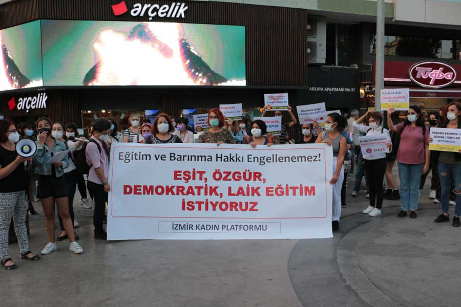 İzmir Kadın Platformu (İKP) eğitim ve barınma hakkı, demokrasi ve laiklik için Alsancak Sevinç pastanesi önünde basın açıklaması yaptı. “Eğitim ve barınma hakkı engellenemez. Eşit, özgür, demokratik, laik eğitim istiyoruz” yazılı pankart açan kadınlar sık sık, “Susmuyoruz, korkmuyoruz, itaat etmiyoruz”, “Diyanet elini hayatımızdan çek”, “Yaşasın kadın dayanışması” sloganları attı.